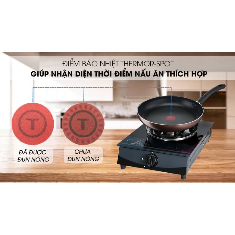 Tefal tích hợp cho chảo công nghệ Thermor-spot, ở giữa lòng chảo có điểm báo chữ T vòng tròn màu đỏ nổi bật. Khi chảo đạt đủ độ nóng cho bạn bắt đầu nấu ăn, điểm báo sẽ thay đổi chi tiết và màu sắc giúp người dùng dễ nhận biết và cho thức ăn vào chế biến, giúp nấu chín thức ăn nhanh và ngon hơn.