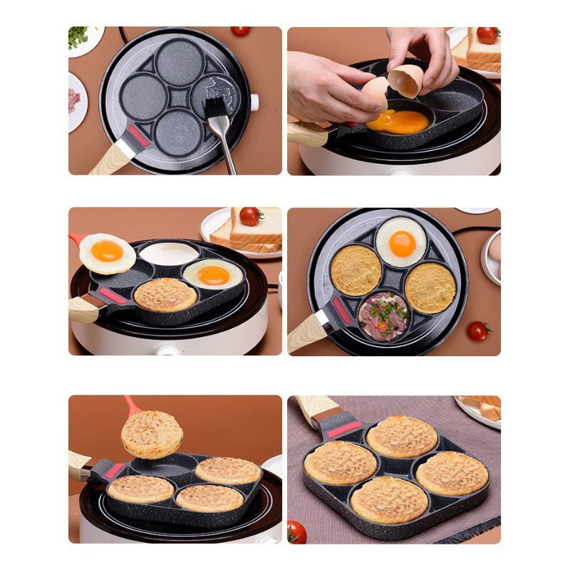 Giới thiệu Chảo Chiên Làm Bánh, Rán Trứng 4 Ngăn 4 Lỗ Chống Dính Tay Cầm Gỗ Dùng Được Cho Mọi Loại Bếp