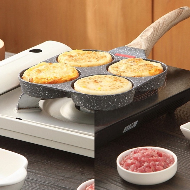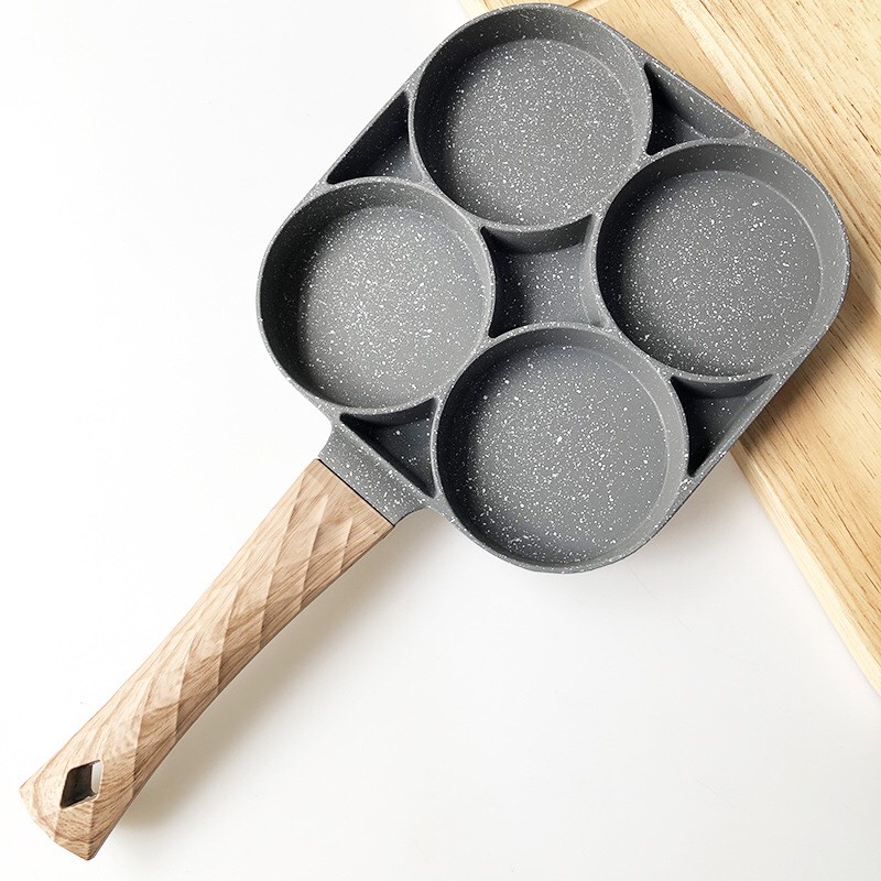 ✍Khuôn Chảo Chiên Rán Trứng Làm Bánh 4 Ngăn 4 Lỗ Chống Dính- Chống Dính Tay Cầm Gỗ