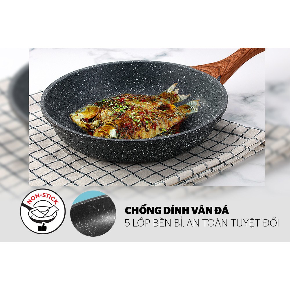 Sản phẩm sử dụng chống dính vân đá 5 lớp có độ bền bỉ tối ưu. Nhờ đó, bạn có thể giảm đi một lượng đáng kể dầu mỡ khi chiên xào mà không cần e ngại thực phẩm dính sát vào lòng chảo. Lớp chống dính dày dặn này cũng đảm bảo an toàn sức khỏe cho cả gia đình.