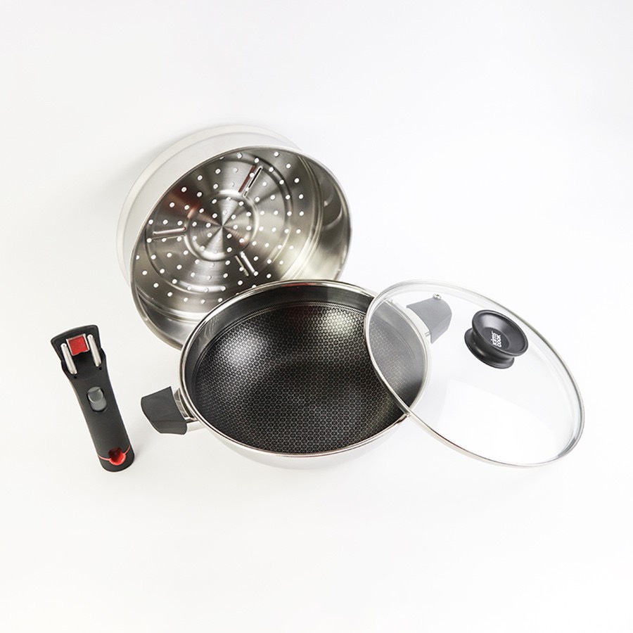 Kết cấu 3 lớp dẫn nhiệt đều và nhanh mang đến những món ăn trọn vẹn hương vị tươi ngon và tốt cho sức khỏe cả gia đình. Tay cầm tháo rời giúp dễ dàng chùi rửa, giảm thiểu vướng víu khi nấu ăn và tiết kiệm không gian cất trữ.