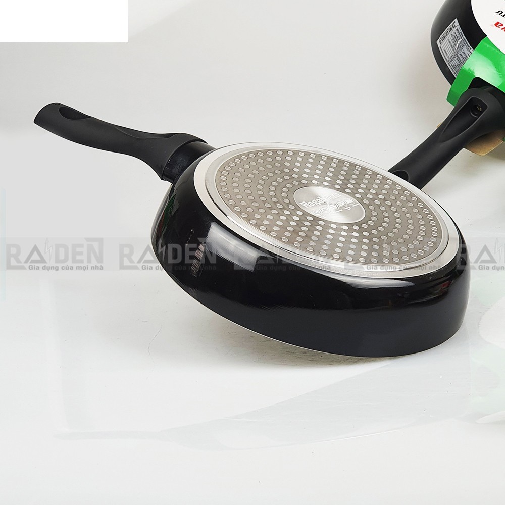 - Chảo sử dụng hợp kim nhôm dày 4mm khiến chảo chắc chắn hơn, không sợ va đập.