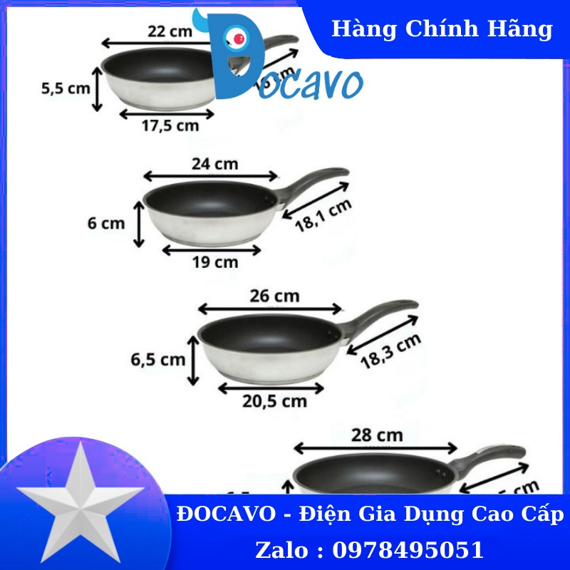 - Size chảo chống dính Fivestar tính đường kính miệng chảo , đáy chảo nhỏ hơn khoảng 5 - 6cm so với miệng chảo tùy từng size.