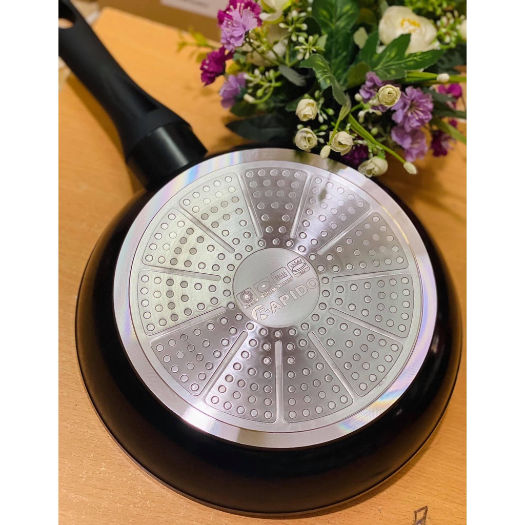 Khác với những loại chảo từ sản xuất theo công nghệ dập khuôn hiện nay, chảo từ Rapido được chế tạo bằng phương pháp đúc nhôm để tạo thành một chiếc chảo nhôm nguyên khối. Ưu điểm của chảo từ Rapido là độ cứng cao, dẫn nhiệt và giữ nhiệt tốt. Từ đó giúp tiết kiệm năng lượng, món ăn chín đều, nhanh hơn, giữ được độ tươi ngon của nguyên liệu. Vì được đúc nguyên khối nên đáy từ không bị phồng đảm bảo độ phẳng tối đa, giúp tiếp xúc với mặt bếp từ tốt nhất.