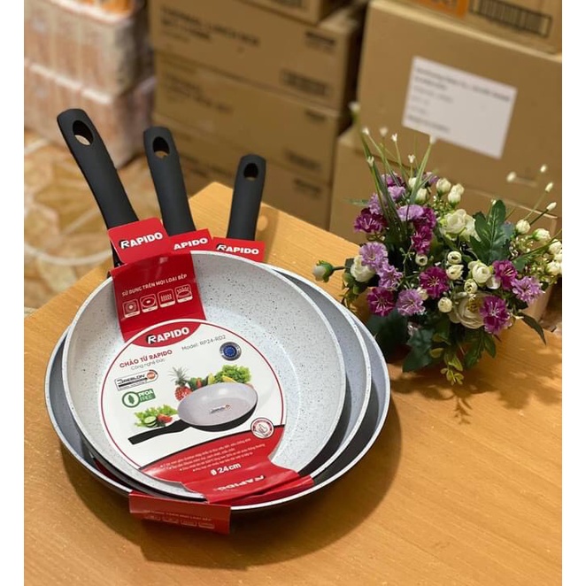 - Vật liệu chảo: Khác với những loại chảo từ sản xuất theo công nghệ dập khuôn hiện nay, chảo từ Rapido được chế tạo bằng phương pháp đúc nhôm để tạo thành một chiếc chảo nhôm nguyên khối. Ưu điểm của chảo từ Rapido là độ cứng cao, dẫn nhiệt và giữ nhiệt tốt. Từ đó giúp tiết kiệm năng lượng, món ăn chín đều, nhanh hơn, giữ được độ tươi ngon của nguyên liệu. Vì được đúc nguyên khối nên đáy từ không bị phồng đảm bảo độ phẳng tối đa, giúp tiếp xúc với mặt bếp từ tốt nhất.
