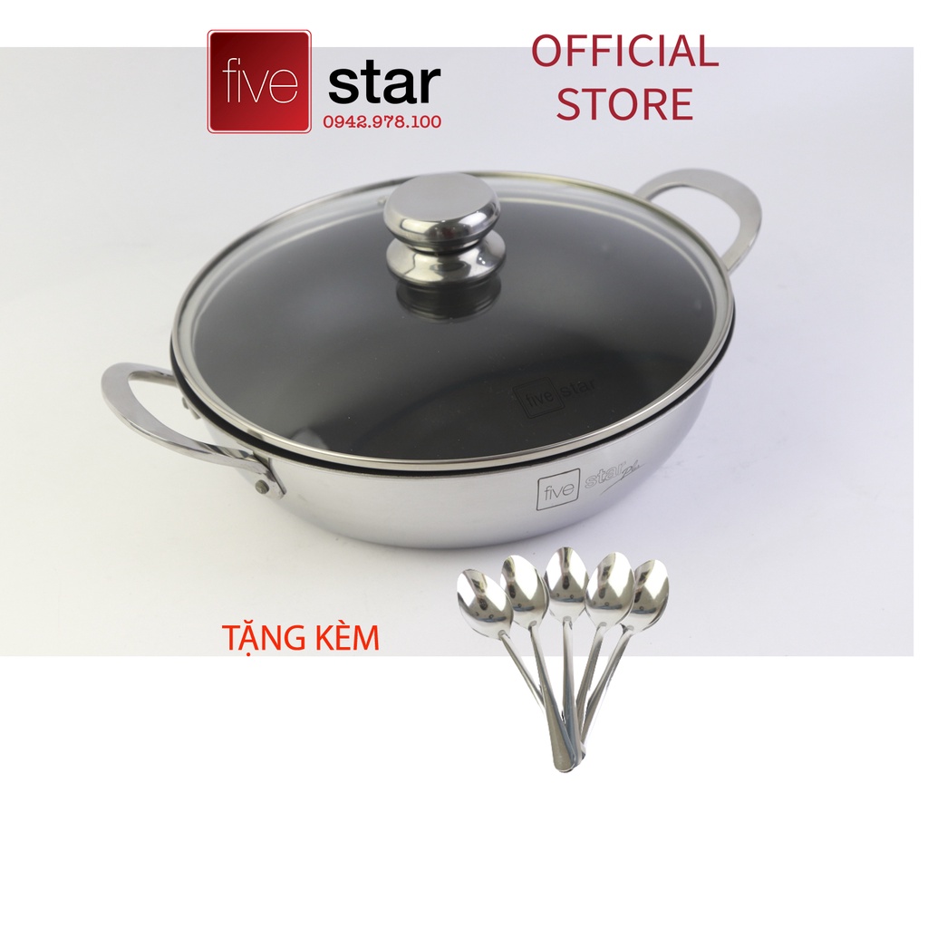 Chảo chống dính cao cấp Fivestar 2 quai có nắp kính 18cm / 22cm /26cm , tặng 5 muỗngChảo chống dính 2 lớp Fivestar 2 quai được sản xuất từ inox 430 bền đẹp, cứng chắc.