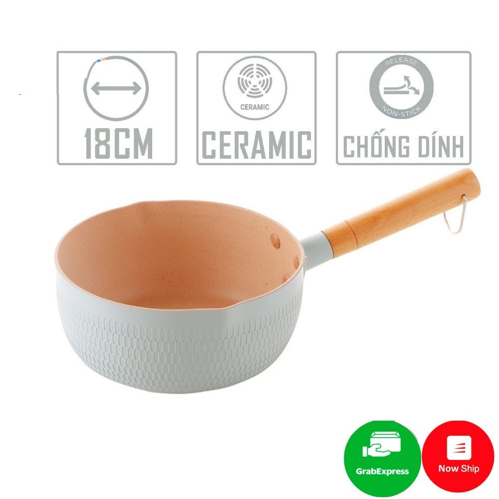Chảo chống dính Ceramic đáy lòng sâu có tay cầm cán gỗ chống bỏng màu pastel lúa mạch