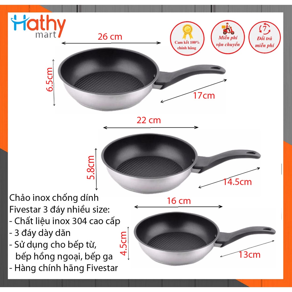 Chảo từ FiveStar chống dính với nhiều kích thước khác nhau cùng với thiết kế 3 đáy dày dặn có khả năng hấp thu và tỏa nhiệt đều sẽ giúp bạn chiên, xào, dán các món ăn một cách nhanh chóng giúp bạn tiết kiệm thời gian cũng như nhiên liệu khi đun nấu. Do đó chảo từ Fivestar luôn là sự lựa chọn thông minh phải không các bạn?Sau đây Hà Thy Mart sẽ giới thiệu đến các bạn 3 loại chảo từ Fivestar với 3 kích thước 16 - 22 - 26cm nhé.