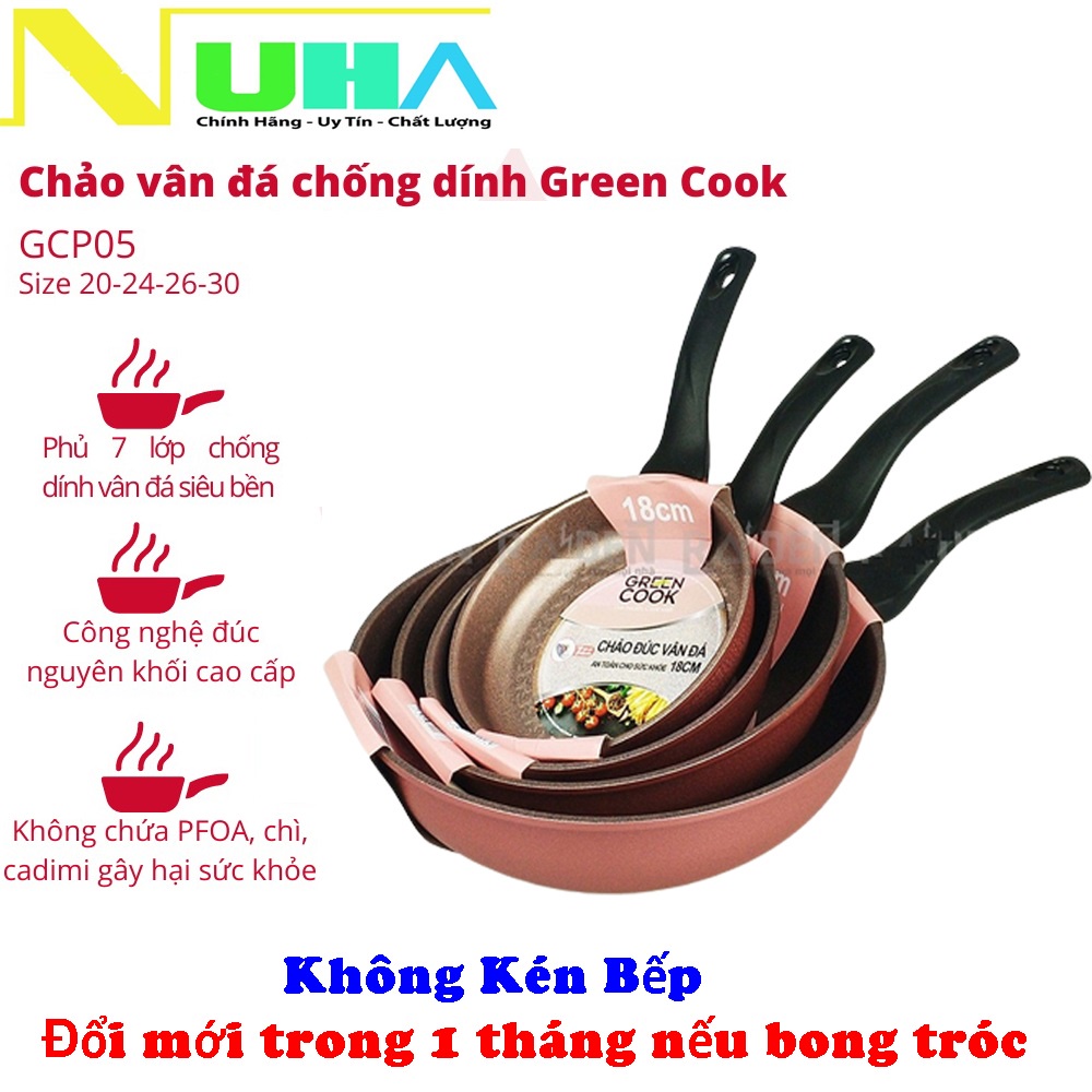 Chảo chống dính đúc vân đá đáy từ dày 7 lớp Green cook GCP05 size 18/20/26/30cm dùng được mọi loại bếp, chuẩn hình