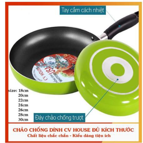 CHẢO CHỐNG DÍNH HỢP KIM NHÔM CV HOUSE 18CM ĐẾN 30CMBề mặt chảo được chống dính 3 lớp, chịu được nhiệt cao, chống trầy xước, có khả năng phân tán và giữ nhiệt tốt, giúp thức ăn chín nhanh và đều khắp, tiết kiệm năng lượng khi nấu.