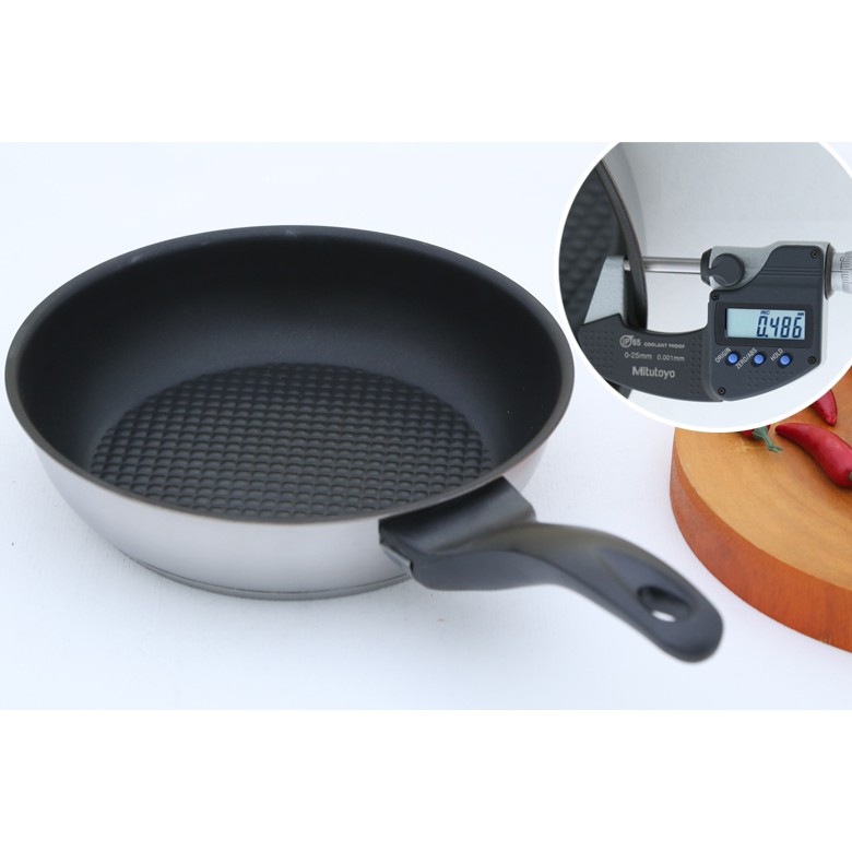 Mặt ngoài là Inox sáng bóng, mặt trong có tráng lớp chống dính đặc biệt không làm dính thức ăn vào chảo sau khi chiên (rán). Thích hợp đun trên bếp ga, bếp than, bếp điện, bếp từ...