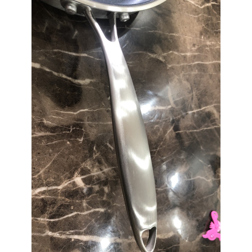 - Cán chảo dài, thiết kế dễ cầm nắm, có bọc lớp nhựa cách nhiệt siêu bền, chống bỏng giúp người dùng sử dụng thuận tiện và an toàn. Cán được ốc vít chắc chắn vào thân chảo, có sẵn móc treo tiện cất giữ sau khi dùng.