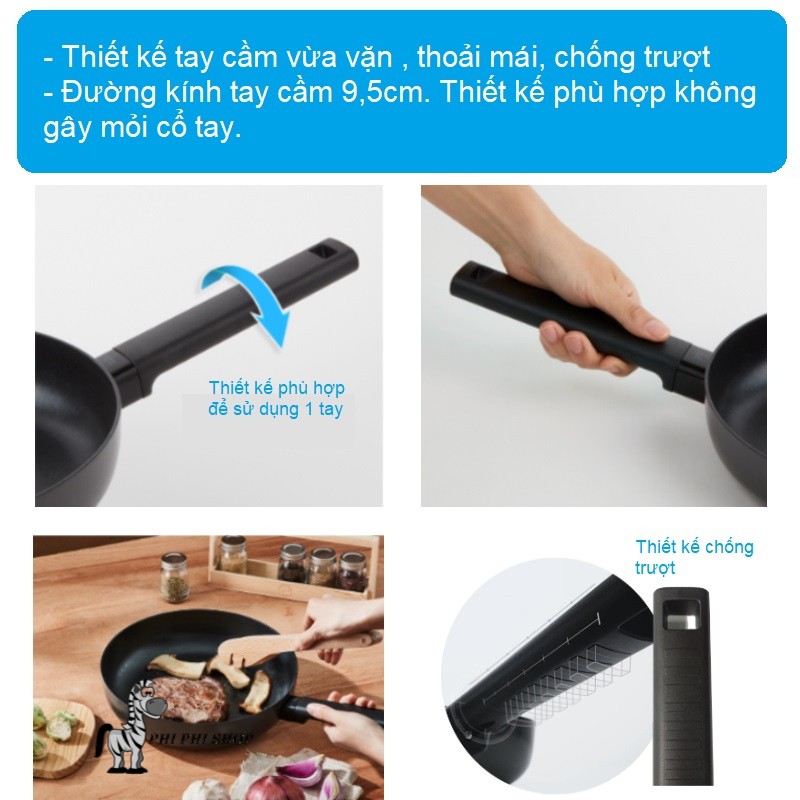- Thiết kế tay cầm chống trượt, vừa vặn, giúp bạn sử dụng thoải mái, mang lại niềm vui khi nấu ăn tại nhà.