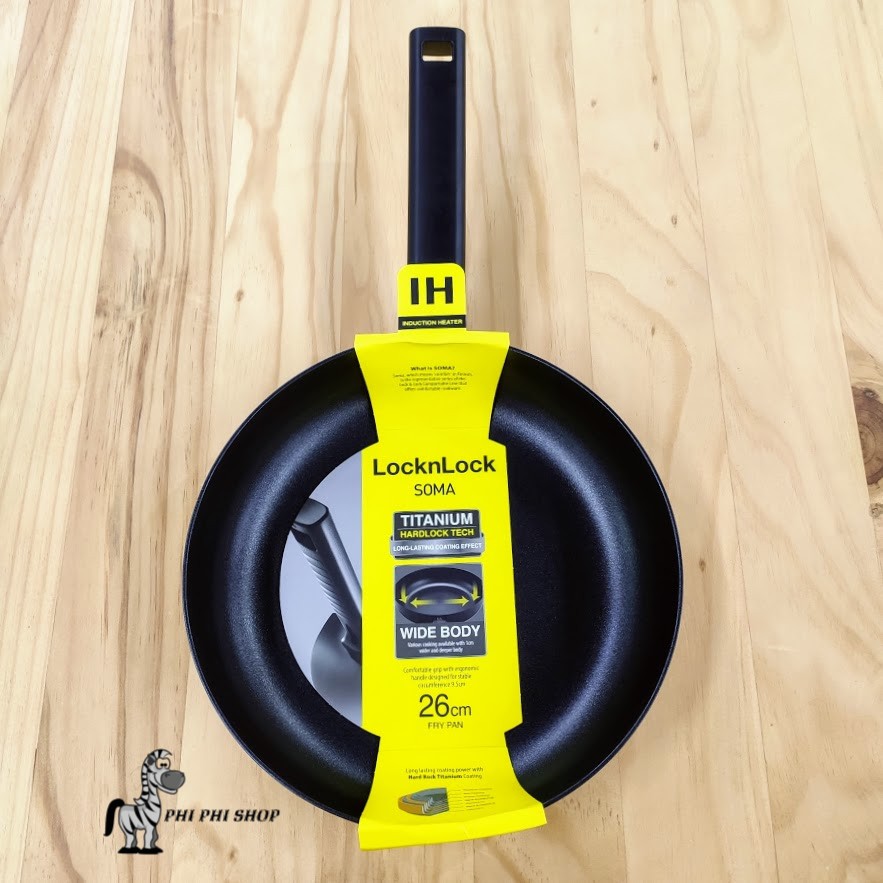 Chảo chống dính LocknLock Soma với lớp phủ Titanium đáy từ- Chất liệu: thân nhôm phủ titanium , tay cầm nhựa bakellite- Màu sắc: đen