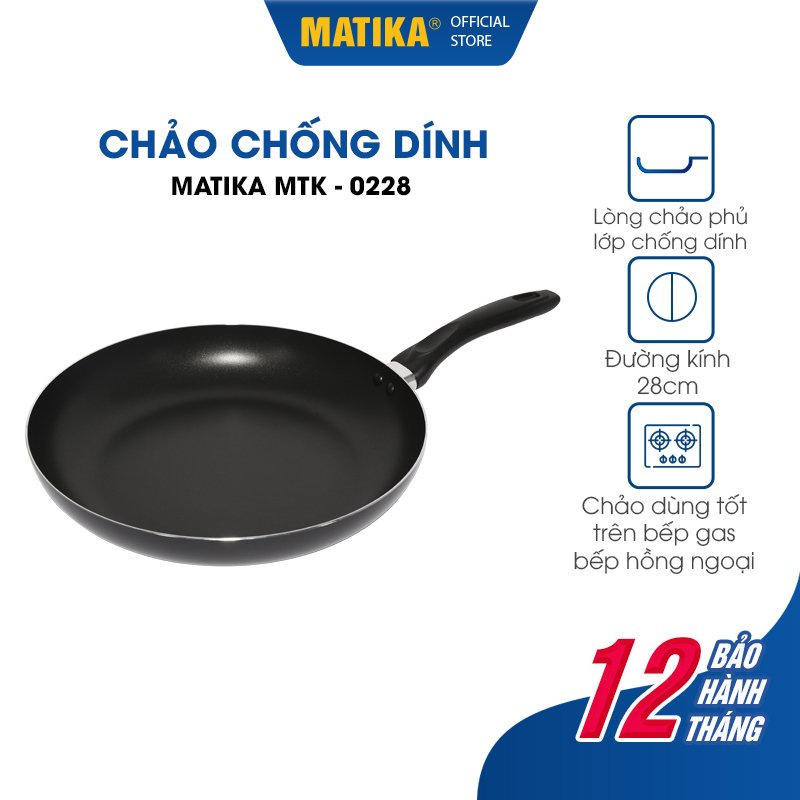 Chảo Chống Dính MATIKA Size 28cm MTK-0228Chảo chống dính Matika MTK-0228 chất liệu hợp kim nhôm cao cấp phủ lớp chống dính siêu bền, đường kính chảo 28 cm giúp bạn thỏa sức chiên xào thực phẩm mà không lo vỡ nát.