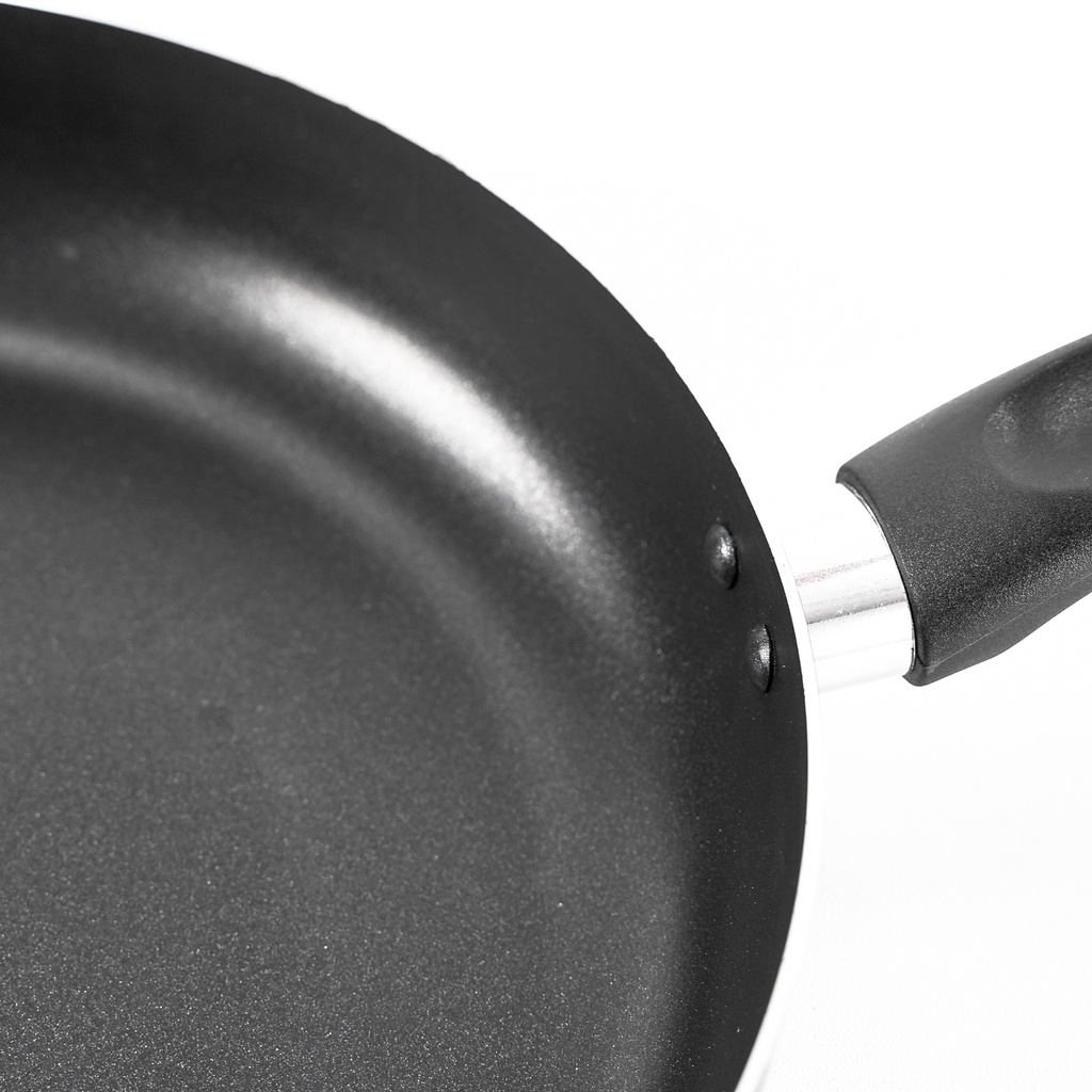 Đáy chảo có đường kính lớn (28cm), được thiết kế đơn giản hài hòa với mọi không gian bếp. Tay cầm bọc nhựa cách nhiệt gắn vào thân bằng đinh tán chắc chắn, bảo vệ bạn không bị nóng khi di chuyển chảo. Thiết kế chống trơn trượt dưới đáy chảo đảm bảo an toàn khi sử dụng.