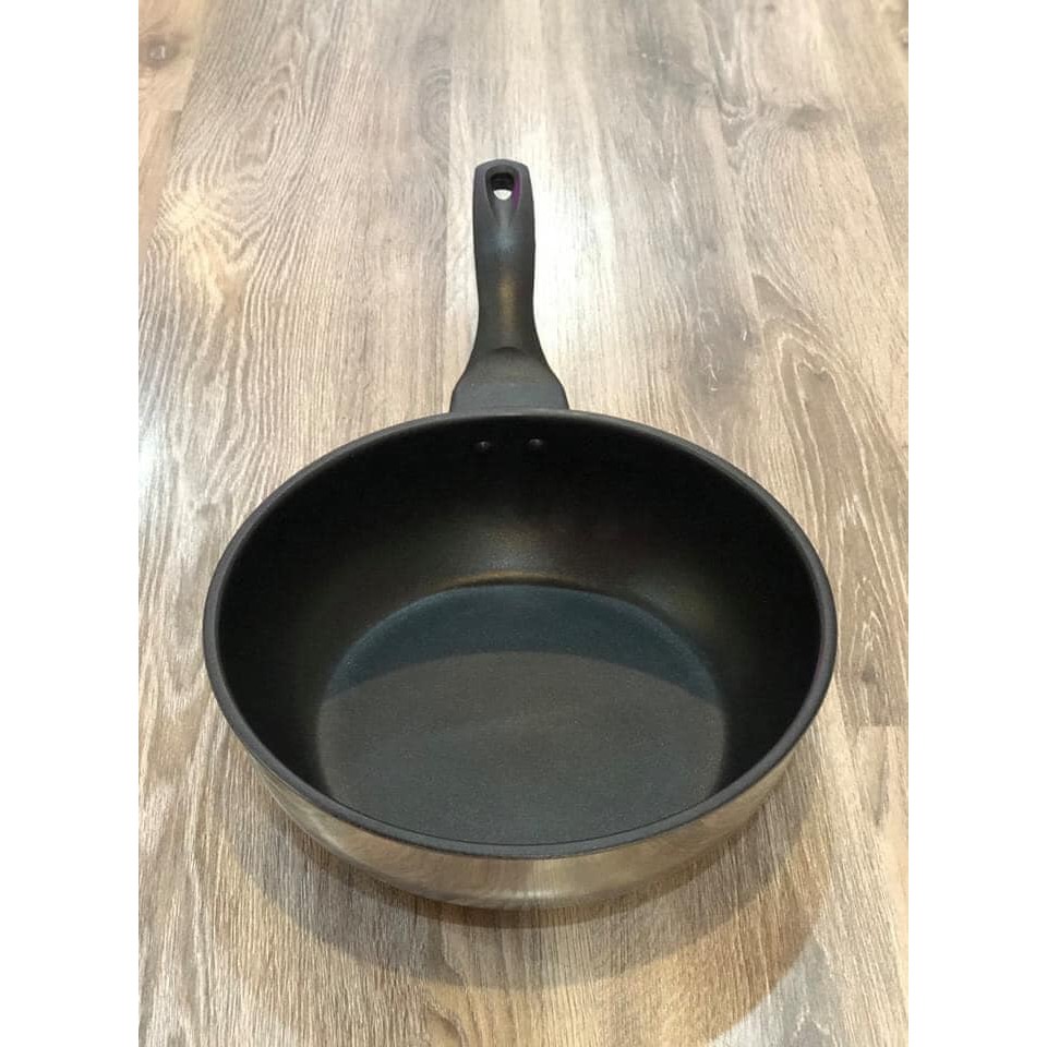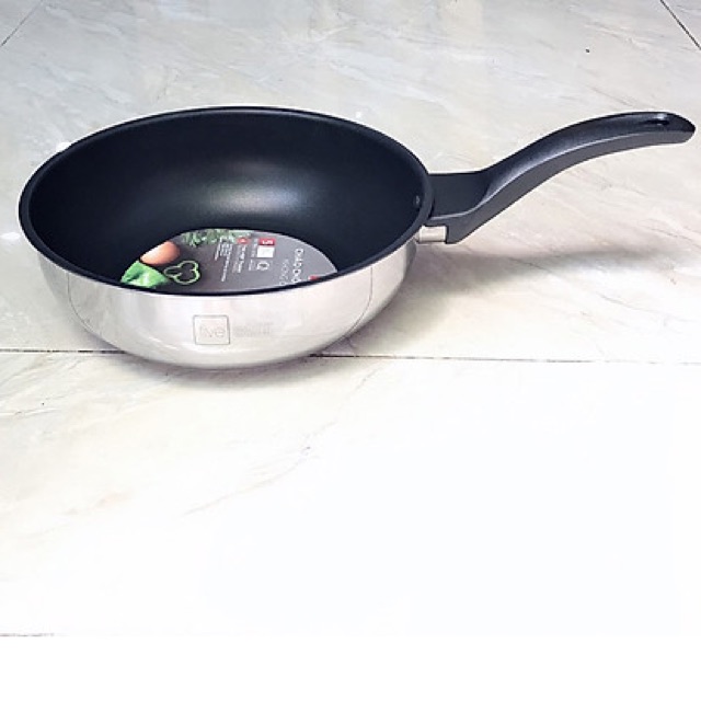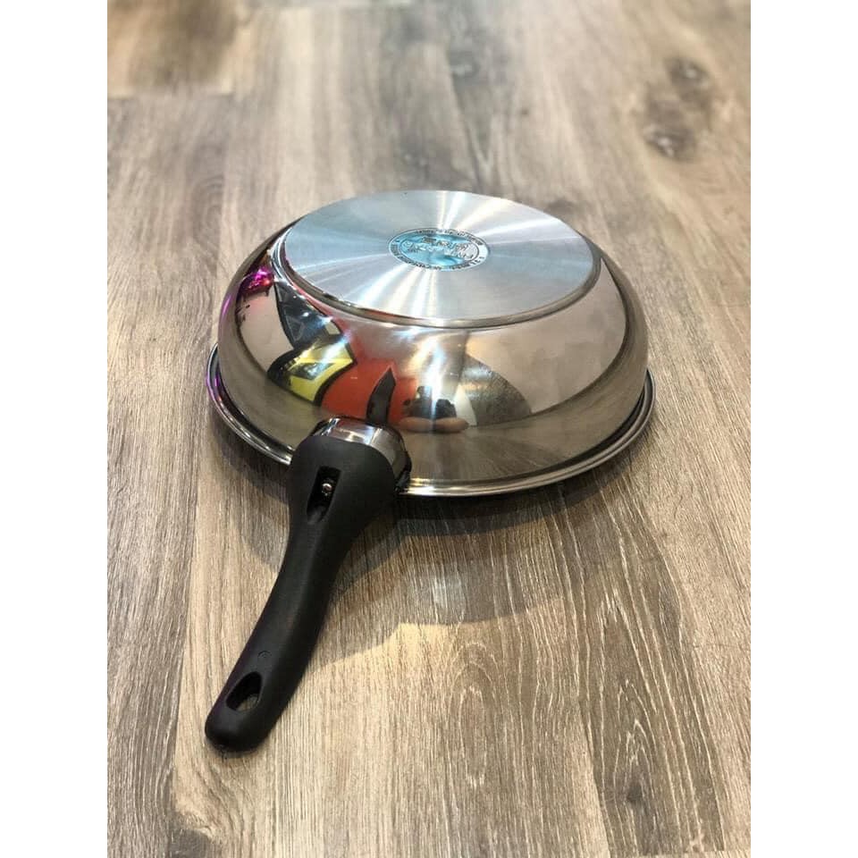 Chảo được làm từ chất liệu inox 430 được dập nguyên khối, không gỉ, không ôxy hóaĐáy chảo cấu tạo 3 lớp dày dặn giúp việc tỏa nhiệt đều lên toàn bộ lòng chảo