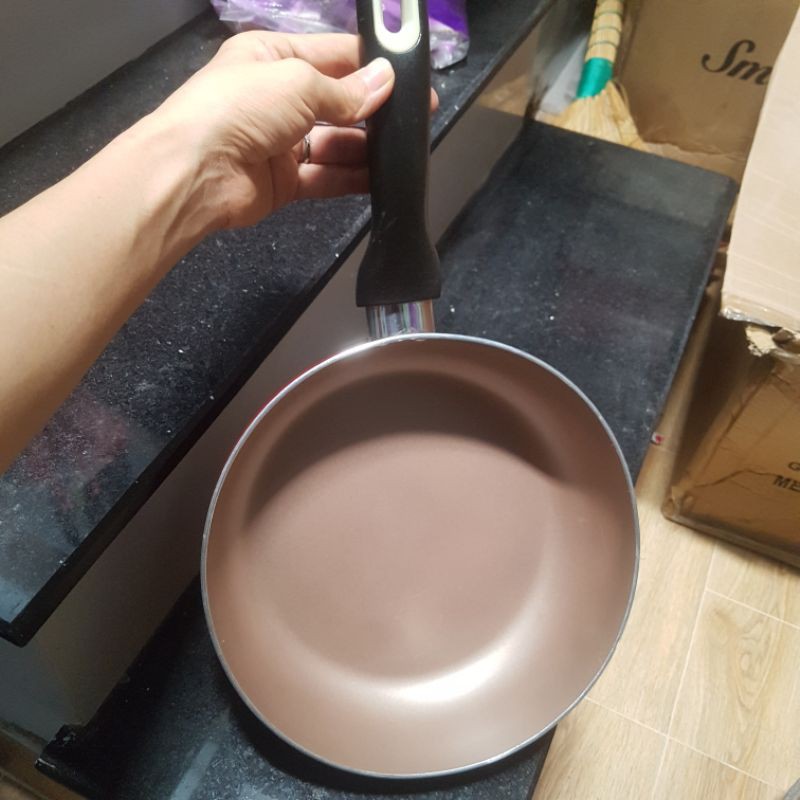 - Cán chảo bakelit chịu nhiệt lên đến 180 độ C, được tán 3 đinh chắc chắn giúp thoải mái khi sử dụng