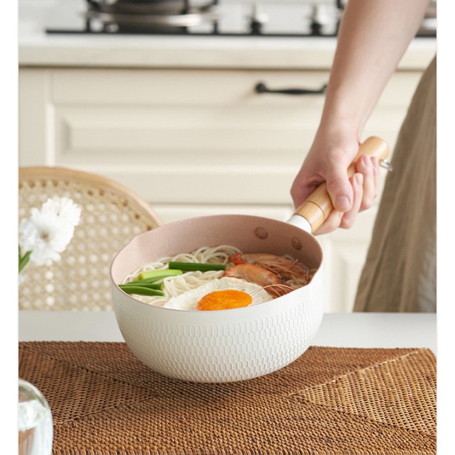 - Với chảo chống dính sâu lòng 18cm giúp cho việc nấu ăn được dễ dàng, từ việc chiên, xào đến nấu bột cho bé.
