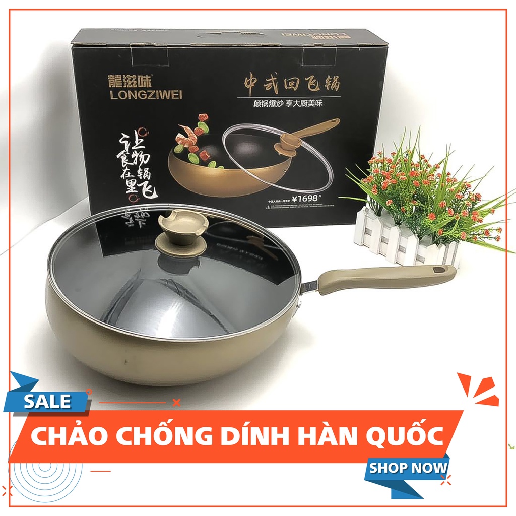 Chảo chống dính sâu lòng đáy vàng Có Hộp, thiết kế tay cầm cách nhiệt, chống dính tốt, an toàn cho sức khoẻ