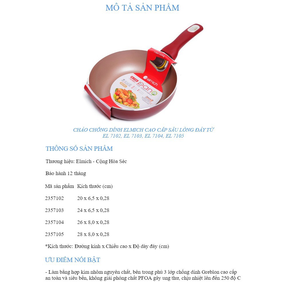 TÊN SẢN PHẨM:chảo chống dính sâu lòng elmich.xin có lưu ý đặc biệt về dòng chảo chống dính này: Hiện có một số đơn vị bán dòng sản phẩm chảo chống dính này mẫu tương tự với giá rất rẻ, khuyến cáo đó là dòng sản phẩm lô khuyến mại, sẽ không được mới, dễ bong tróc sơn. Hàng của shop là sản phẩm chính hãng, mới và là hàng nhà máy.
