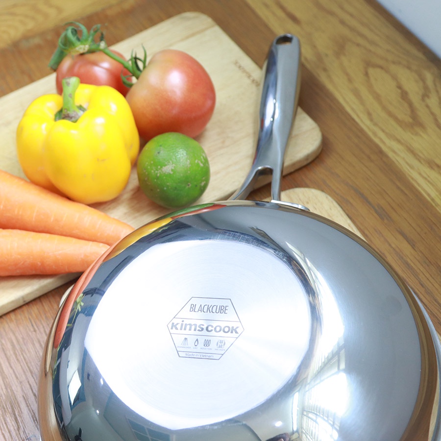 Chất liệu: Inox 304, 3 lớp đáy liền, lòng phủ chất chống dính công nghệ Blackcube Hàn Quốc, vung kính cường lực, quai tán