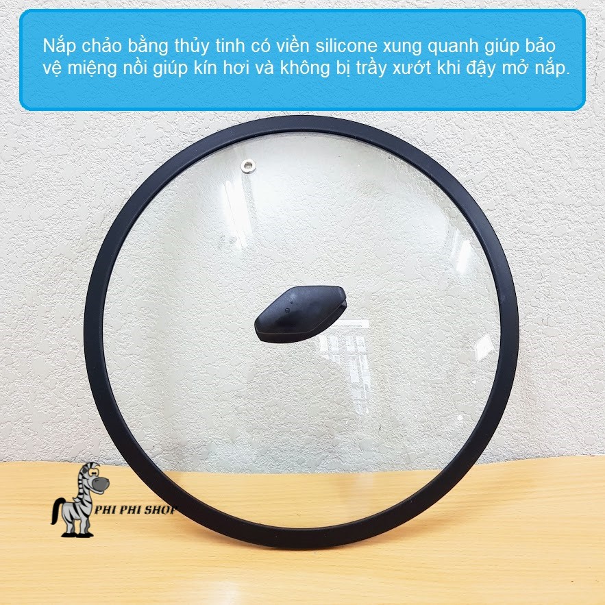 Nắp chảo bằng thủy tinh có viền silicone xung quanh giúp bảo vệ miệng nồi giúp kín hơi và không bị trầy xướt khi đậy mở nắp.