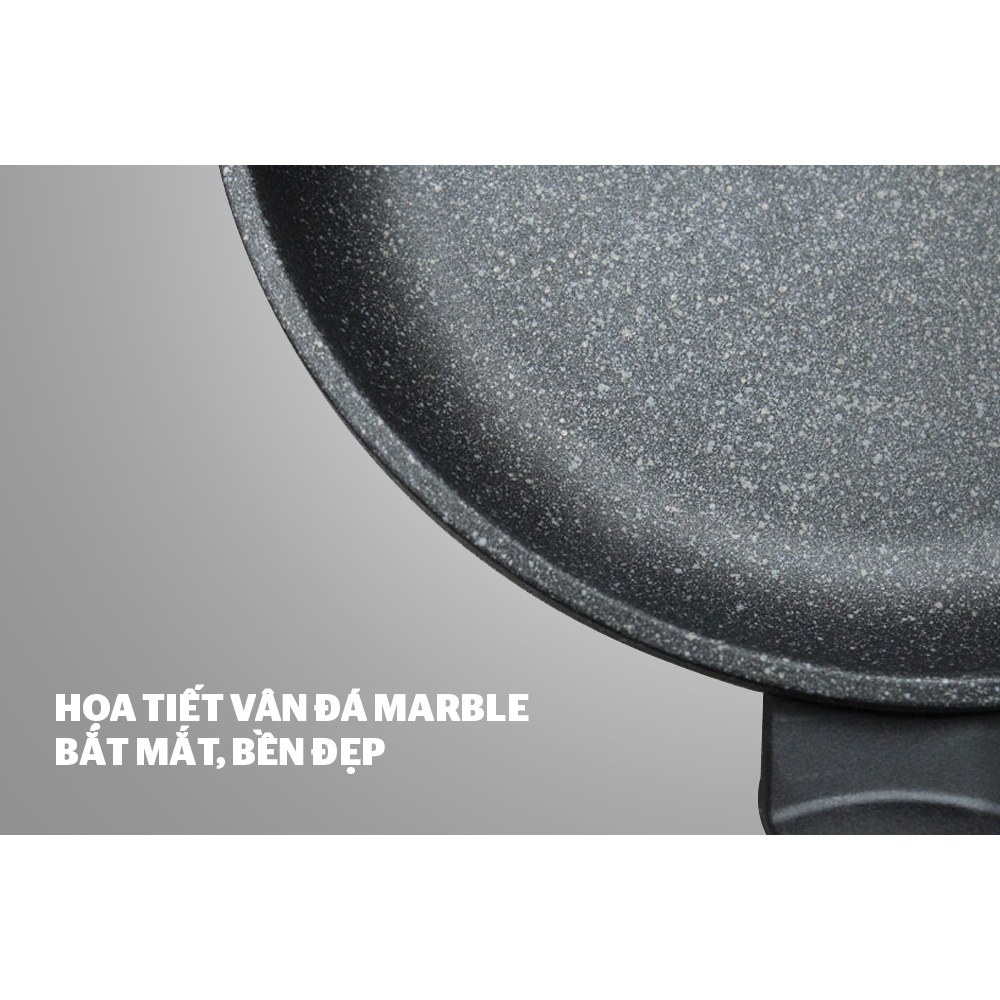 Kiểu dáng hiện đại: Toàn bộ lòng chảo và bề mặt ngoài được phủ lớp vân đá hoa cương marble bền đẹp, phù hợp với không gian bếp trẻ trung.Tay cầm: Tay cầm bọc nhựa chịu nhiệt siêu bền, được bắt vít chắc chắn vào thân chảo, đảm bảo an toàn trong quá trình sử dụng, di chuyển. Phía cuối tay cầm còn được thiết kế có móc treo tiện dụng.