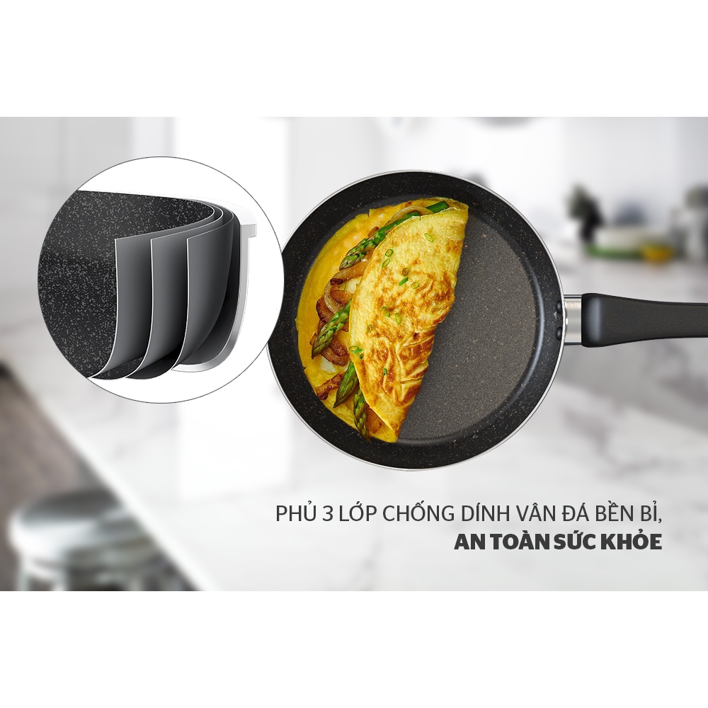 Sản phẩm sử dụng chống dính vân đá có độ bền bỉ tối ưu. Nhờ đó, bạn có thể giảm đi một lượng đáng kể dầu mỡ khi chiên xào mà không cần e ngại thực phẩm dính sát vào lòng chảo. Lớp chống dính dày dặn này cũng đảm bảo an toàn sức khỏe cho cả gia đình.