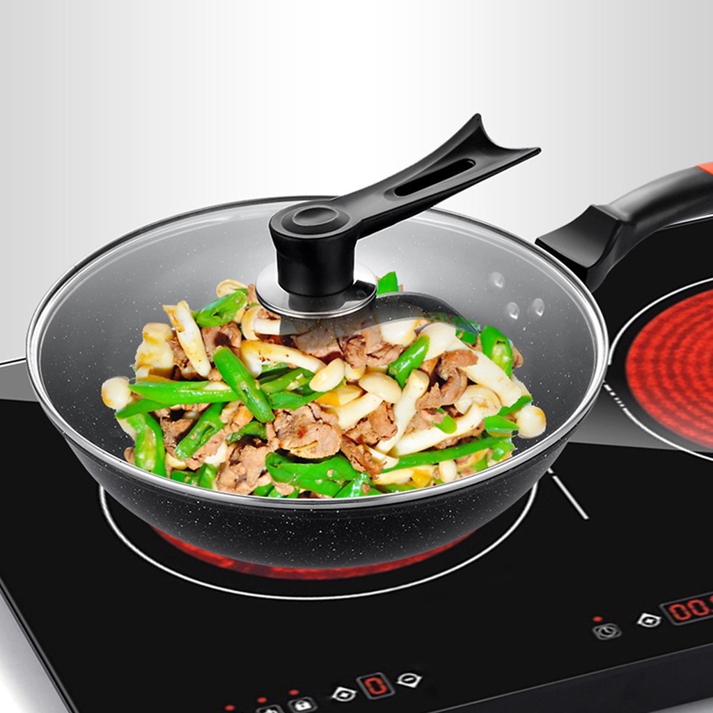 - Chảo được thiết kế có vung kính bằng thủy tinh cao cấp giúp chị em dễ dàng quan sát thức ăn trong quá trình chế biến thức ăn