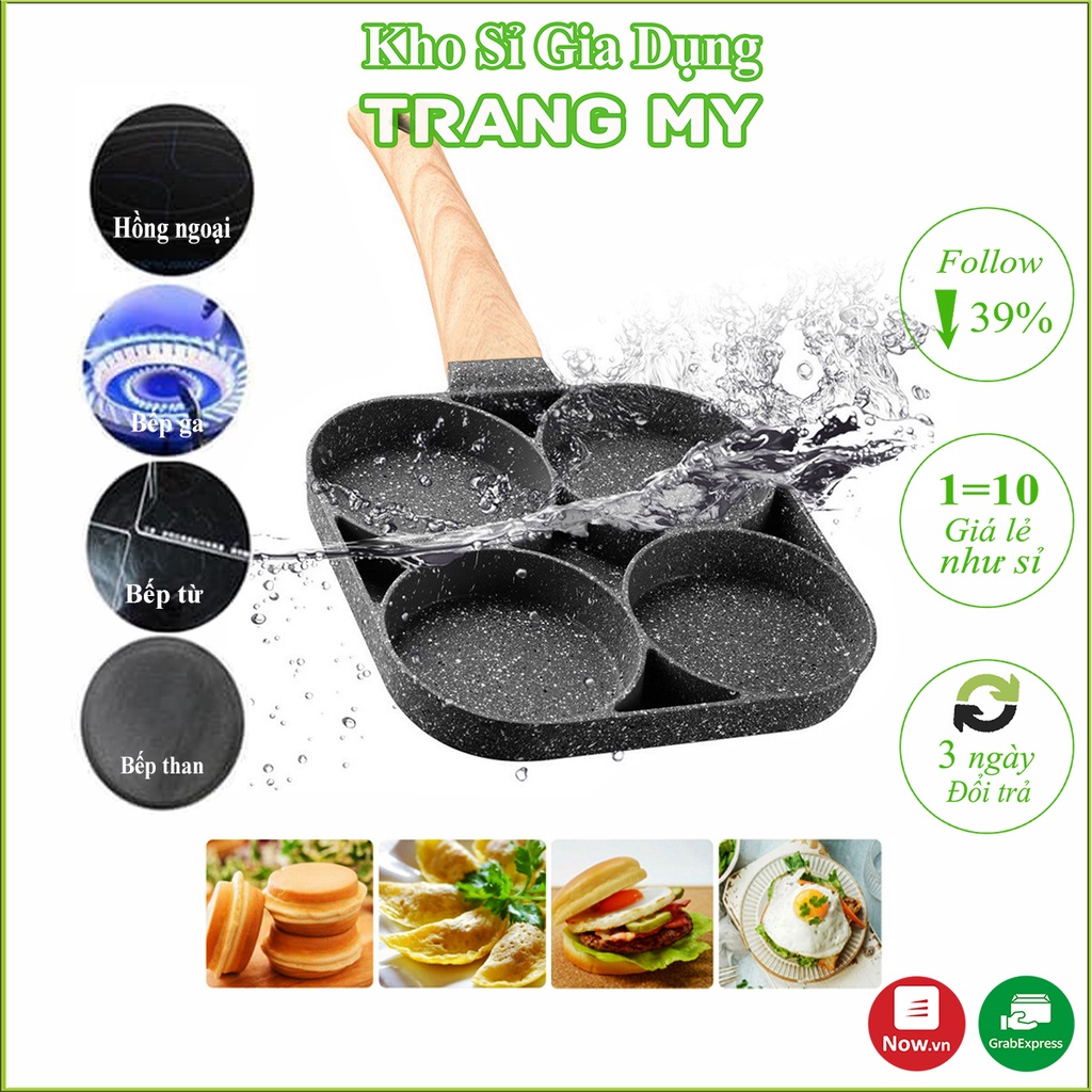 Giới thiệu Chảo Đá 4 Ngăn Chống Dính Cao Cấp , chiên trứng, làm bánh 4 món trong 1, tay cầm bằng cán gỗ Sang Trọng