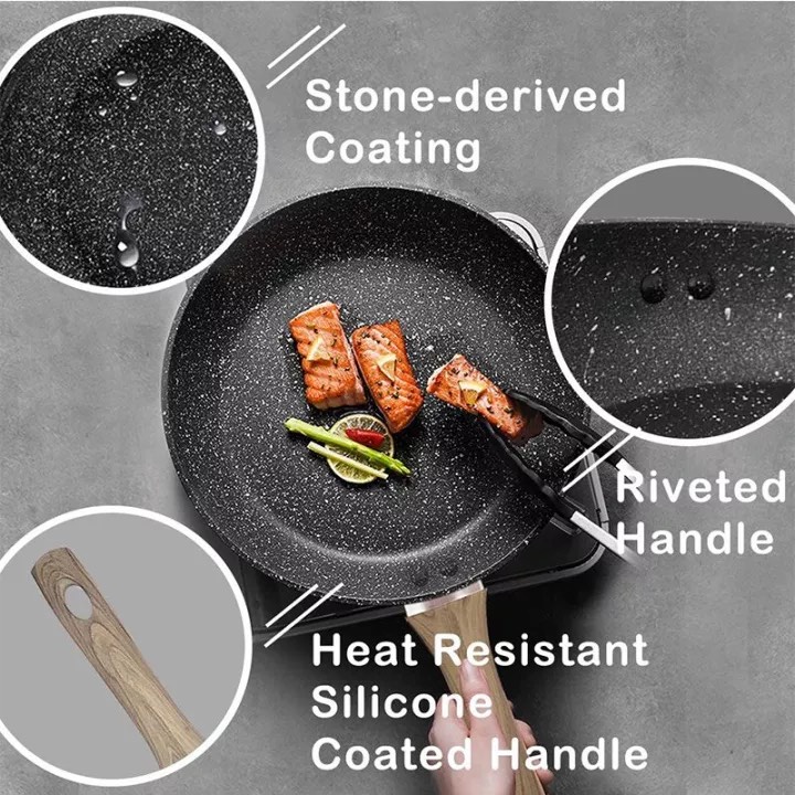 Chảo chống dính vân đá hoa cương đáy inox bếp từ không chứa PFOA an toàn cho sức khỏe 20-28cm1. ĐẶC ĐIỂM CHẢO CHỐNG DÍNH VÂN ĐÁ HOA CƯƠNG ĐÁY INOX BẾP TỪ: