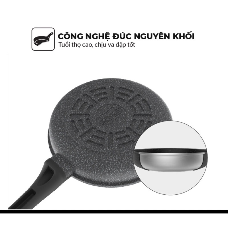 Lòng chảo được phủ 3 lớp chống dính nhập khẩu từ Hoa Kỳ và đá marble giúp hạn chế cháy dính trong quá trình sử dụng. Bên ngoài chảo được phủ một lớp sơn chịu nhiệt, giúp nhiệt độ lan tỏa đều, nhanh chín thức ăn.