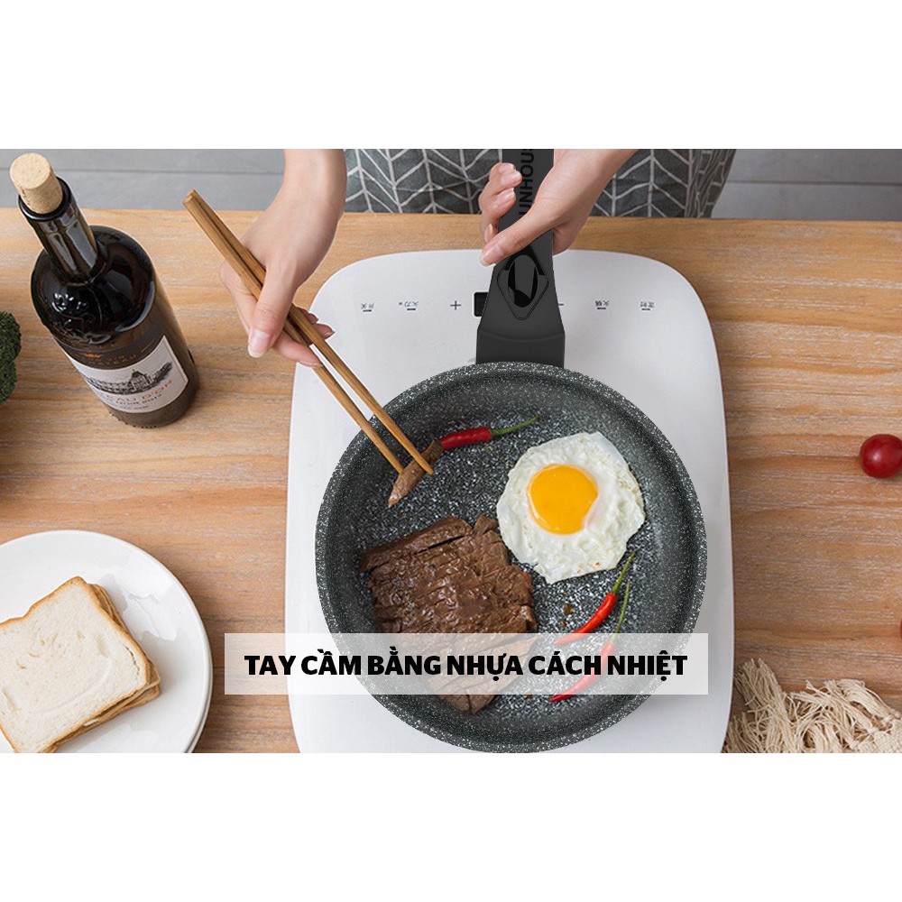 Nấu ăn nhanh hơn, tiết kiệm thời gian và nhiên liệu: Chất liệu hợp kim nhôm tráng vân đá hoa cương bắt nhiệt rất tốt, tỏa nhiệt đều giúp dễ dàng xào nấu với lượng thực phẩm vừa đủ cho gia đình từ 3-4 người.