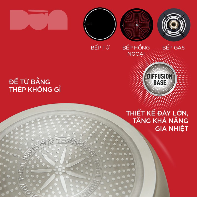 Như hầu hết các sản phẩm khác, mẫu chảo này cũng có đáy làm bằng thép không gỉ cho phép sử dụng trên bếp từ. Lòng chảo có ký hiệu Thermal-spot thông báo mức nhiệt độ tối ưu để nấu nướng. Khi vòng màu đỏ bên ngoài chuyển sang đỏ đều đó là lúc chảo ở nhiệt độ thích hợp, bạn có thể bắt đầu nấu bữa ăn của mình rồi.