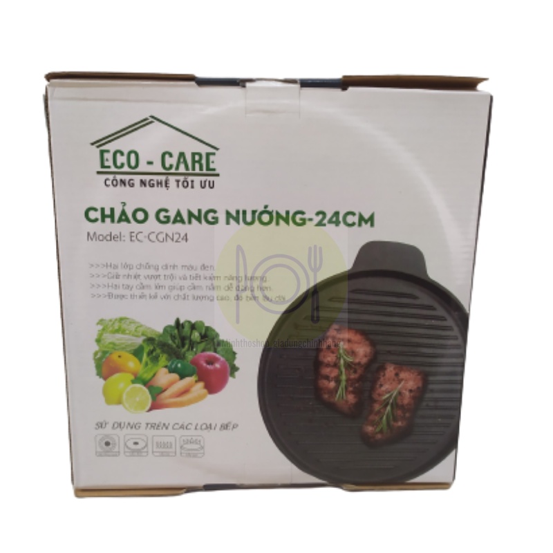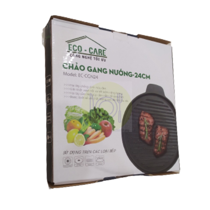 Giới thiệu Chảo gang nướng chống dính ECO-CARE, đường kính 24cm, có rãnh thoát dầu, dùng cho bếp từ, bếp hồng ngoại, bếp điện từ…