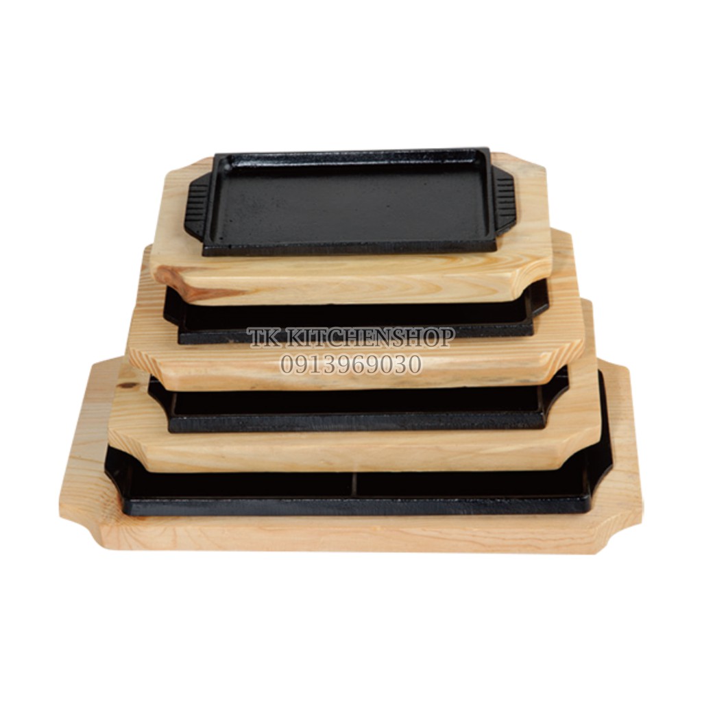 Chảo Gang Nướng Thịt BBQ Bò Bít Tết Steak hình chữ nhật kèm đế gỗ Kiểu Hàn Quốc Dùng Được Bếp Từ