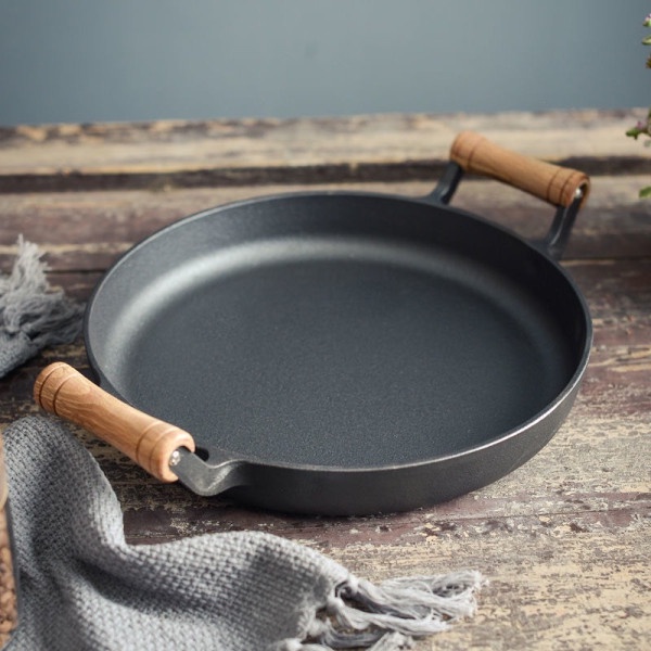 Chảo gang thô nguyên khối 100% với tay cầm gỗ chống nóng