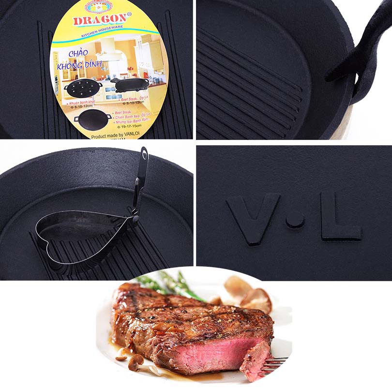 Giới thiệu Bộ chảo gang tròn chống dính bít tết đế gỗ Dragon