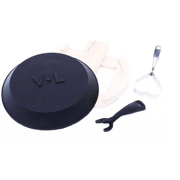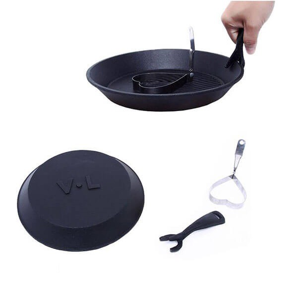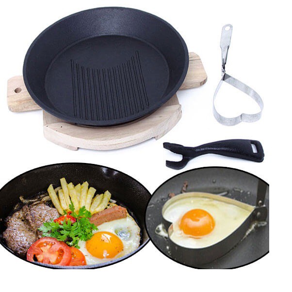 Bộ Chảo Gang Tròn Chống Dính Kèm Đế Gỗ Hàng VNCLC bao gồm 01 chảo gang, 01 lót nhựa, 01 gắp, 1 khuôn tạo kiểu giúp bạn chế biến món bít tết thơm ngon hấp dẫn hay nướng thịt mà không cần nhiều dầu mỡ