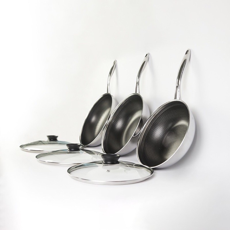Cấu trúc inox 3 lớp, vỏ ngoài là inox 430 để bắt từ, thích hợp với nhiều loại bếp từ kể cả những bếp kén nồi chảo; lớp giữa dầy 1.2mm là nhôm để dẫn và giữ nhiệt, lớp trong tiếp xúc với thực phẩm là inox 304. Tay cầm của chảo bằng inox đúc rỗng, kỹ thuật đặc biệt ghép nối với thành chảo nên không nóng, nhẵn và sáng bóng nên dễ dàng rửa sạch và luôn đẹp, sang trọng. Tay cầm chắc chắn và an toàn.