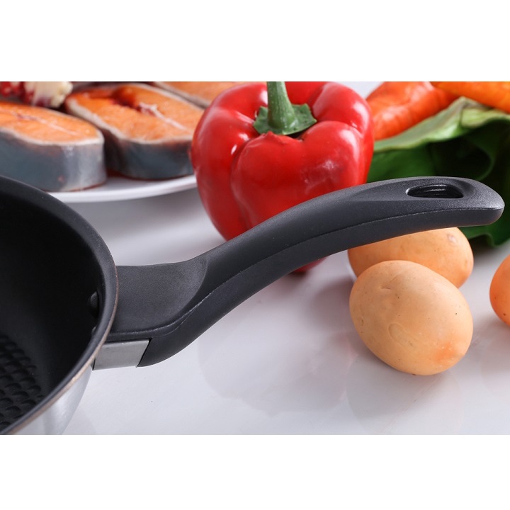 + Đáy chảo 3 lớp. Lớp inox 430 ngoài cùng có đặc tính nhiễm từ, lớp nhôm ở giữa giúp thu nhiệt nhanh và dẫn nhiệt tỏa đều, lớp trong cùng là inox 430 phủ chống dính ít bị oxi hóa, ít phản ứng với thức ăn, đảm bảo an toàn.