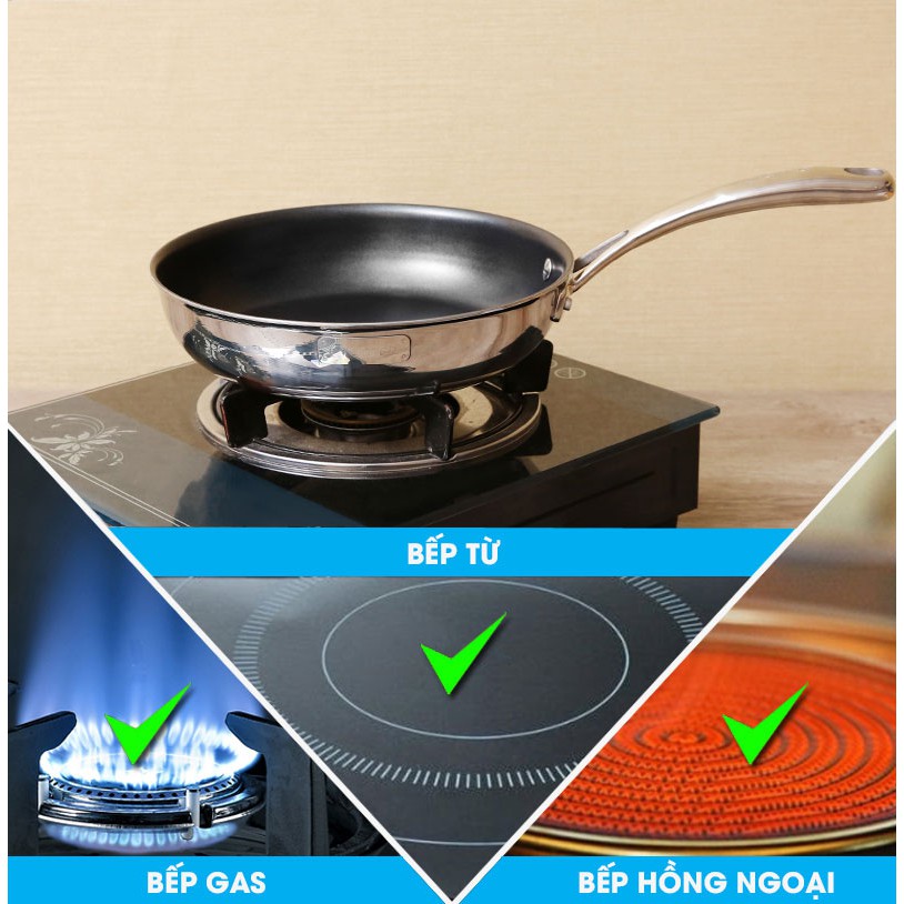 - Dòng sản phẩm: Chảo Inox phủ chống dính đáy liền: Công nghệ chảo tiên tiến nhất hiện nay. Chất liệu Inox liền khối, đáy 3 lớp giúp hạn chế tình trạng đày lồi giữa khi sử dụng lâu ngày. Với công nghệ liền đáy bắt từ cực tốt, không kén bếp từ, giúp tiết kiệm điện năng, khắc phục được rất nhiều hạn chế của chảo nhôm đáy từ (đáy tổ ong)