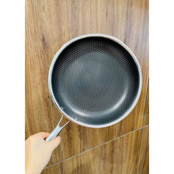 – Lớp bảo vệ hình tổ ong trồi lên mặt chảo giúp nấu nướng thoải mái với bộ dụng cụ kim loại và dùng được trong máy rửa bát mà không lo ảnh hưởng hay trầy xước lớp chống dính.