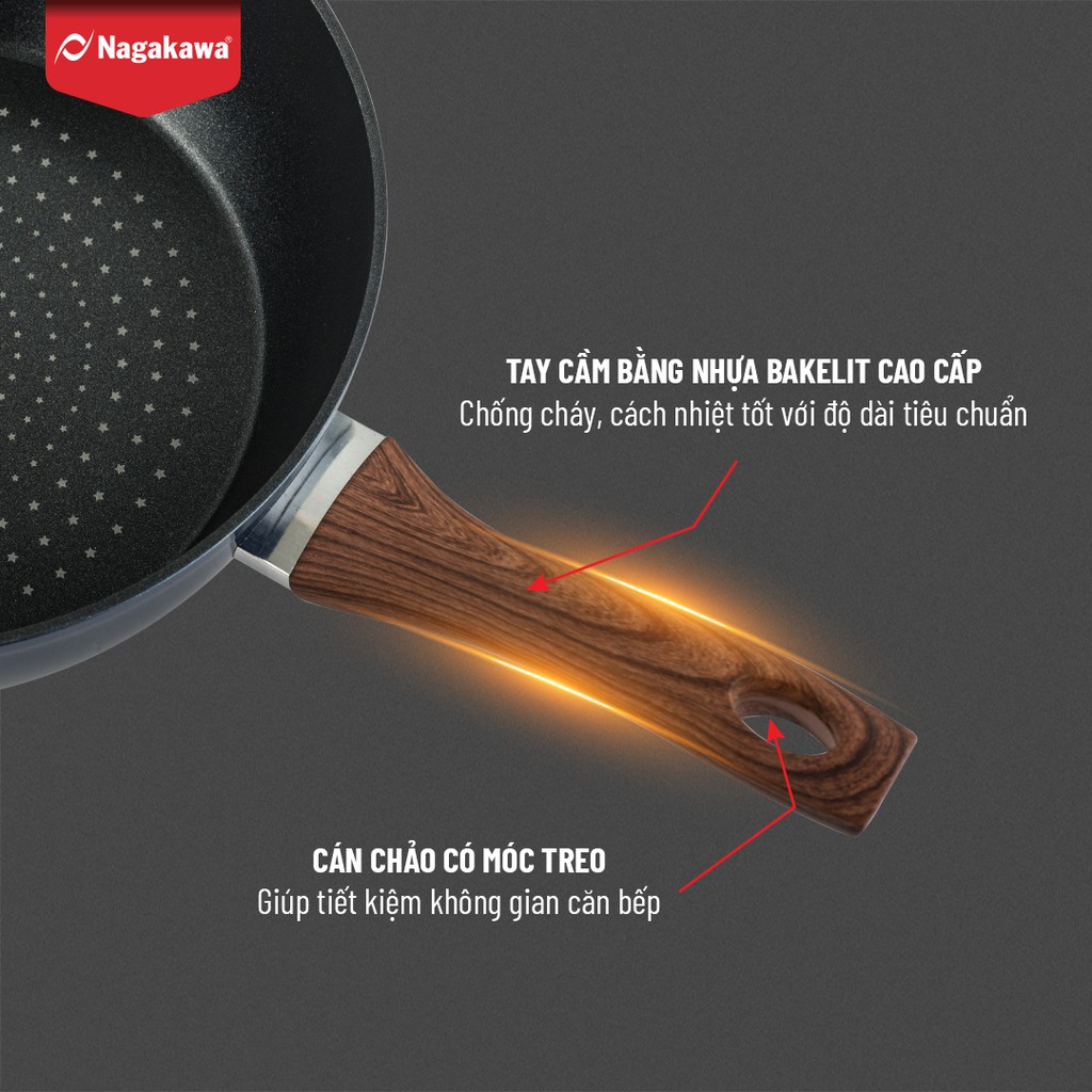 -Chảo Nagakawa NAG2653 được làm bằng chất liệu hợp kim nhôm cao cấp, dẫn nhiệt nhanh và tỏa nhiệt đều. Bên trong phủ 5 lớp chống dính và bám bụi cao cấp an toàn sử dụng, chống cháy khét, dễ dàng vệ sinh.