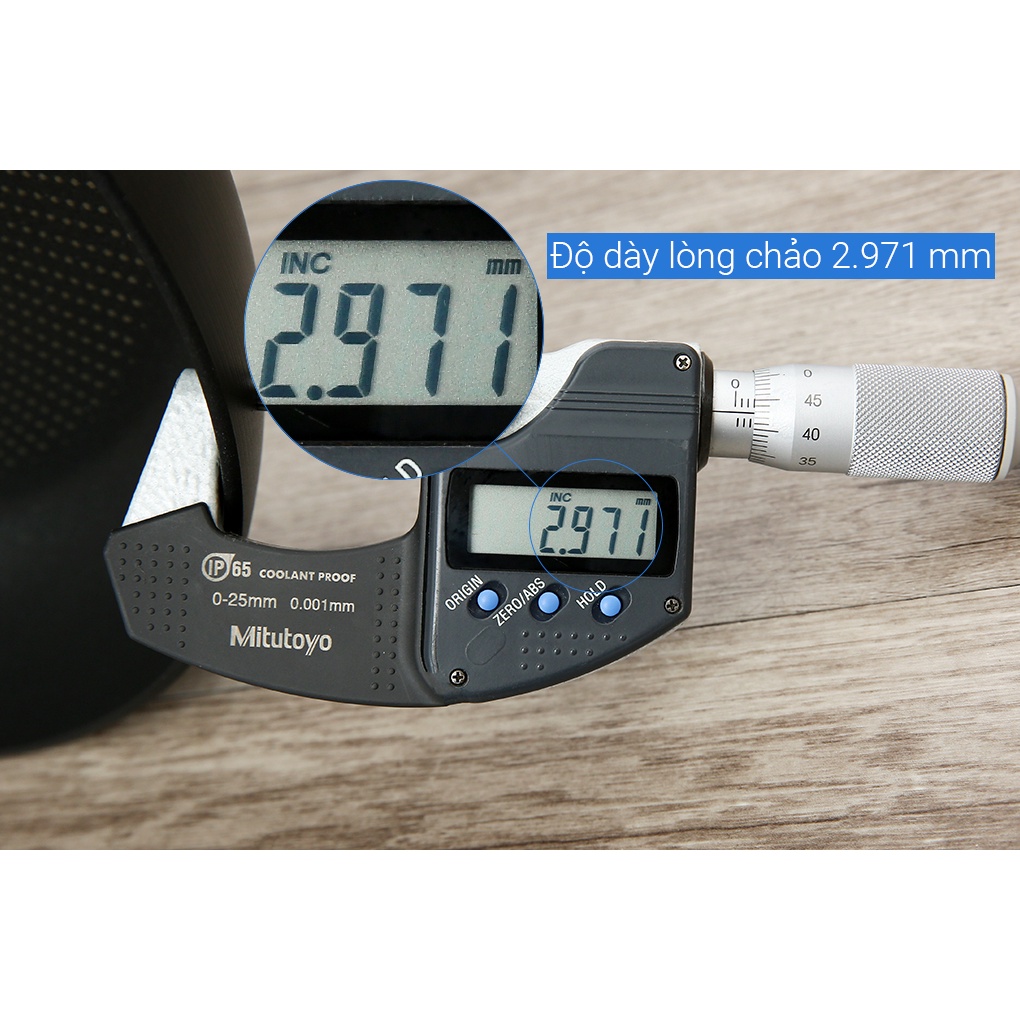 ● Chảo chống dính chất liệu hợp kim nhôm bền bỉ, độ dày chảo lên đến 2.971 mm hạn chế biến dạng do va đập
