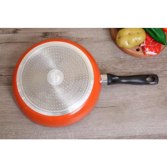 •Chảo chống dính DMX kiểu dáng đơn giản nhưng không kém phần nổi bật với lớp sơn màu cam bên ngoài chảoĐường kính chảo 28 cm (đường kính viền 28.3 cm) có thể chiên được 4 - 5 tỏi gà cùng lúc, chiên cá lớn nguyên con tầm 1.2 kg.