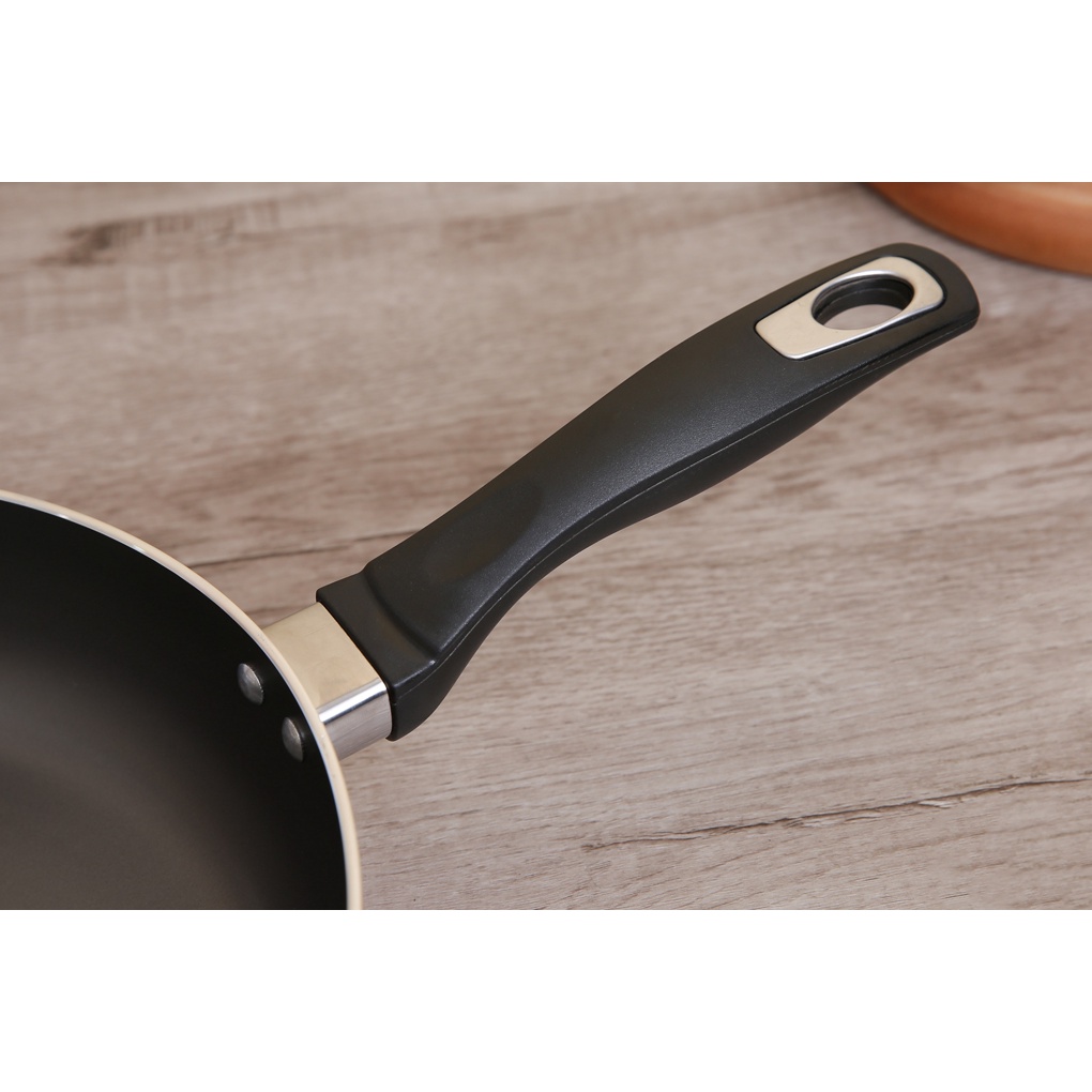 •Tay cầm chảo có bọc nhựa cách nhiệt tiện lợi hơn khi nấu ăn, có sẵn móc treo tiện bảo quản