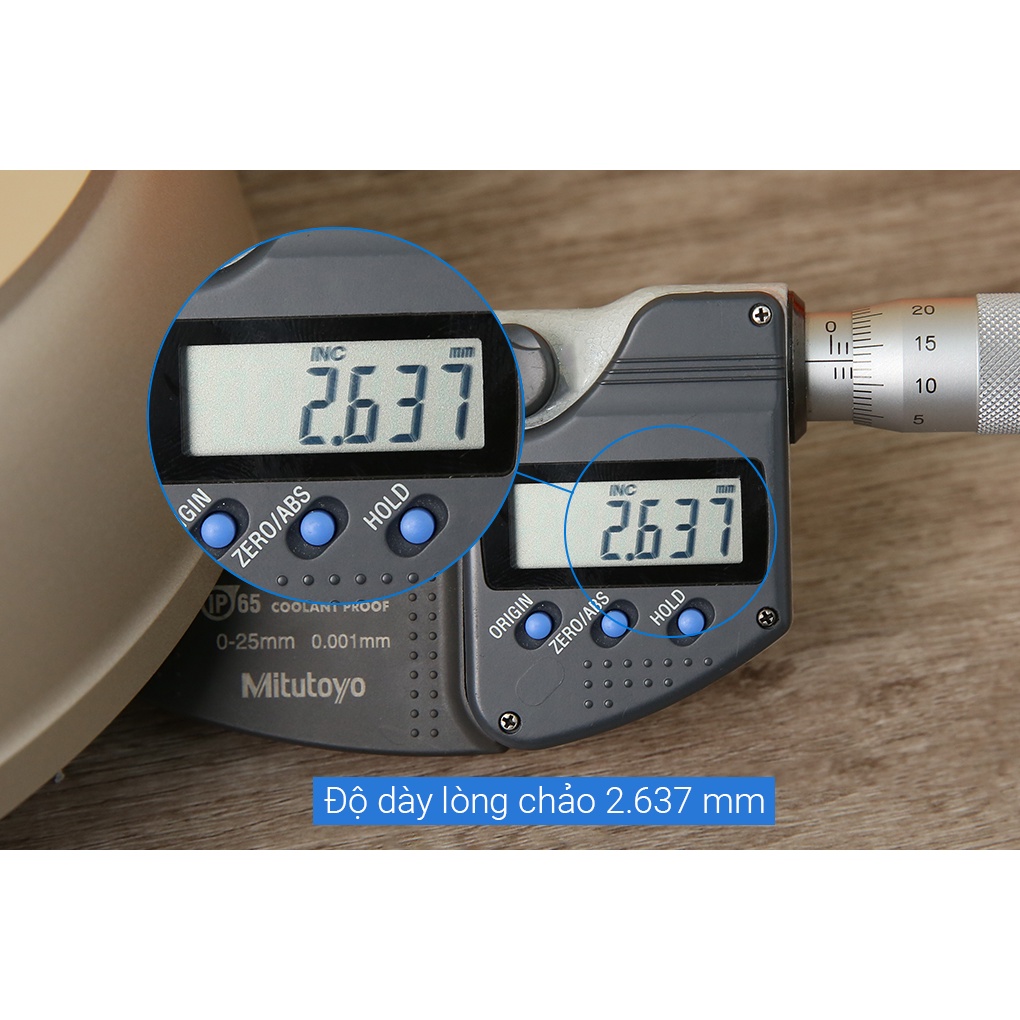 •Bằng hợp kim nhôm, dày 2.637 mm, cảnh báo nhiệt thông minh với công nghệ Thermor-spot tiên tiến. Trong lòng chảo có 1 vòng tròn đỏ chữ "T" khi chảo đặt trên bếp đủ nóng, vòng tròn đỏ sẽ thay đổi màu sắc, chi tiết hình ảnh để cảnh báo cho người nội trợ biết chảo đã nóng có thể bắt đầu nấu ăn. Bề mặt lòng chảo là lớp chống dính phủ sơn Titanium, chịu nhiệt tối đa trong khoảng 380 - 400 oC hạn chế cháy dính, an toàn sức khỏe.