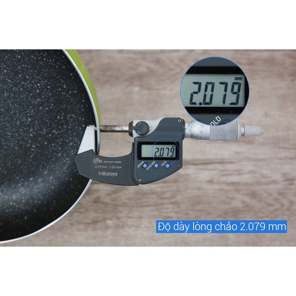 •Chảo dày 2.079 mm giữ nhiệt tốt, chống móp méo khi nấu ăn. Khối lượng chảo 0.82 kg, cầm chắc tay, nấu nướng dễ dàng, thuận lợi.